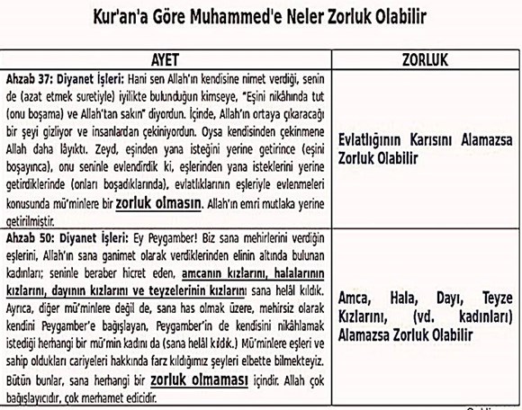 bir gün evlatlığı zeydin karısını çıplak gören muhammedin, zeydin karısına göz dikip, o devrin araplarının bile evlatlığın eşiyle evlenmeyi etik bulmaması sebebiyle durumu meşru kılmak için yazdığı ayet.