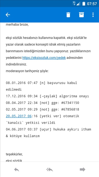 Uçurulmadan önceki son mesajım aşağıdakidir. Diğeri de sonucu. Hukuka aykırı eylem yapmışım. Vay anasını.